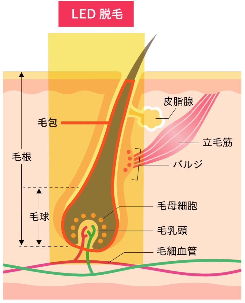 LED 脱毛は直進性と透過性が高いため、肌の表面に熱が集中せず、 安全に毛包組織まで脱毛に有効な光を届けることができます。